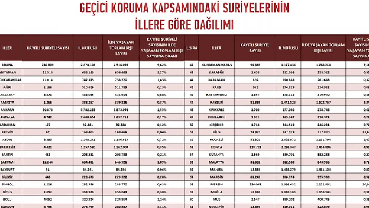 Geçici koruma kapsamındaki Suriyelilerin illere göre dağılımı istatistiğine göre ise Samsun’daki kayıtlı geçici koruma kapsamındaki Suriyeli sayısı 9 bin 51 olarak dikkat çekti. 1 milyon 368 bin 488 nüfusu olan Samsun’da kayıtlı Suriyeli sayısının ilde yaşayan kişi sayısına oranı da yüzde 0,66 olarak belirtildi.