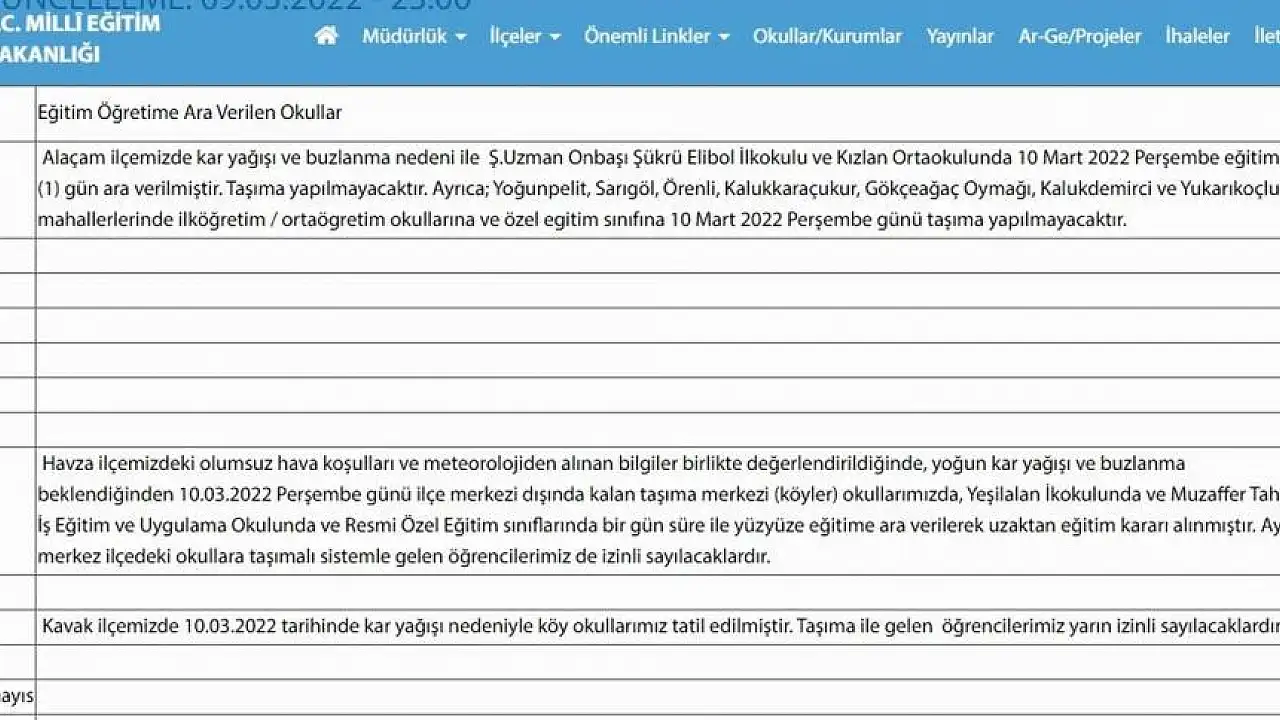 Havza için yapılan açıklamada, “Havza ilçemizdeki olumsuz hava koşulları ve meteorolojiden alınan bilgiler birlikte değerlendirildiğinde, yoğun kar yağışı ve buzlanma beklendiğinden 10 Mart Perşembe günü ilçe merkezi dışında kalan taşıma merkezi (köyler) okullarımızda, Yeşilalan İlkokulunda ve Muzaffer Tahmaz İş Eğitim ve Uygulama Okulunda ve Resmi Özel Eğitim sınıflarında 1 gün süre ile yüz yüze eğitime ara verilerek uzaktan eğitim kararı alınmıştır. Ayrıca merkez ilçedeki okullara taşımalı sistemle gelen öğrencilerimiz de izinli sayılacaklardır” denildi.