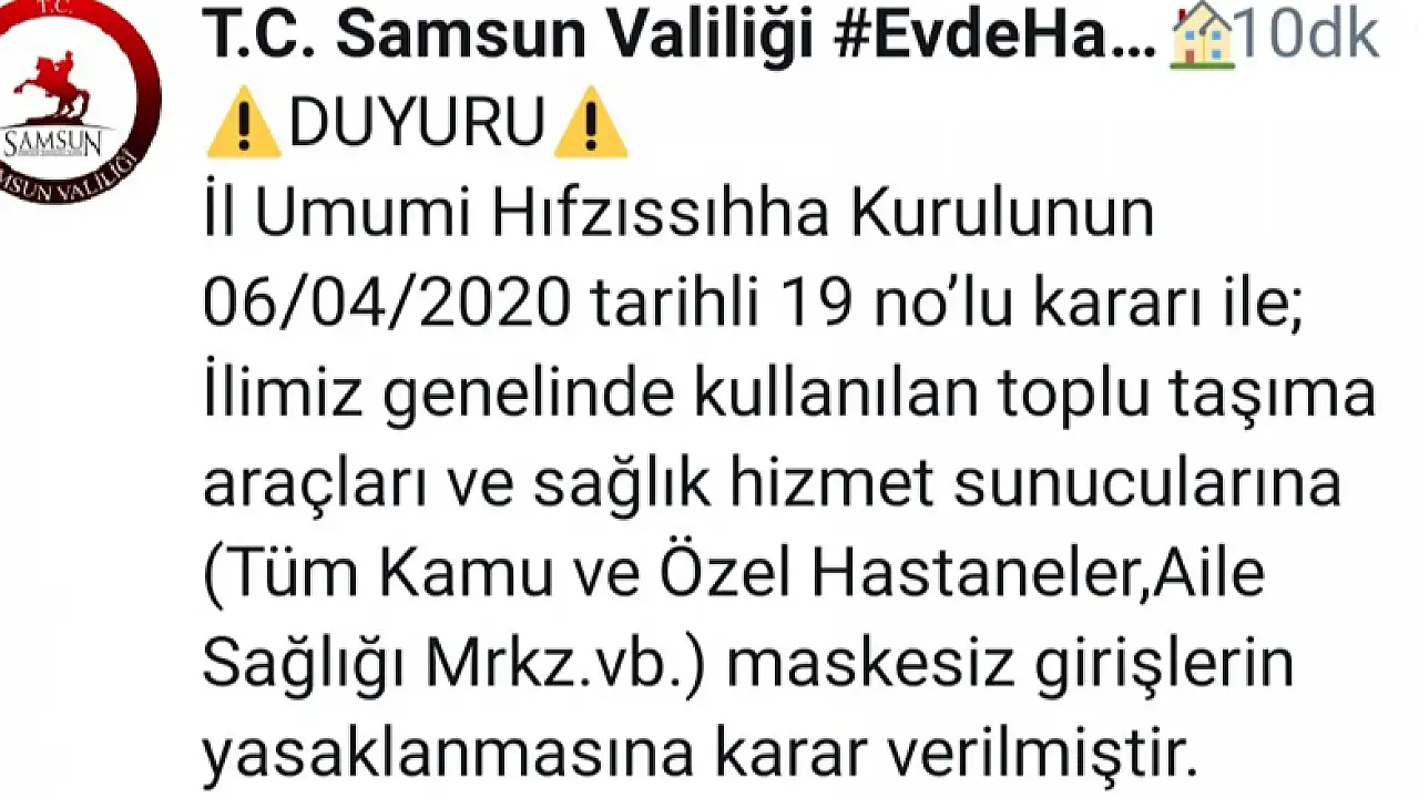 Samsun Valiliği tarafından konuyla ilgili yapılan açıklamada, “İl Umumi Hıfzıssıhha Kurulunun 6 Nisan 2020 tarihli 19 nolu kararı ile ilimiz genelinde kullanılan toplu taşıma araçları ve sağlık hizmet sunucularına (Tüm kamu ve özel hastaneler, aile sağlığı merkezleri ve benzeri) maskesiz girişlerin yasaklanmasına karar verilmiştir” ifadeleri kullanıldı.
