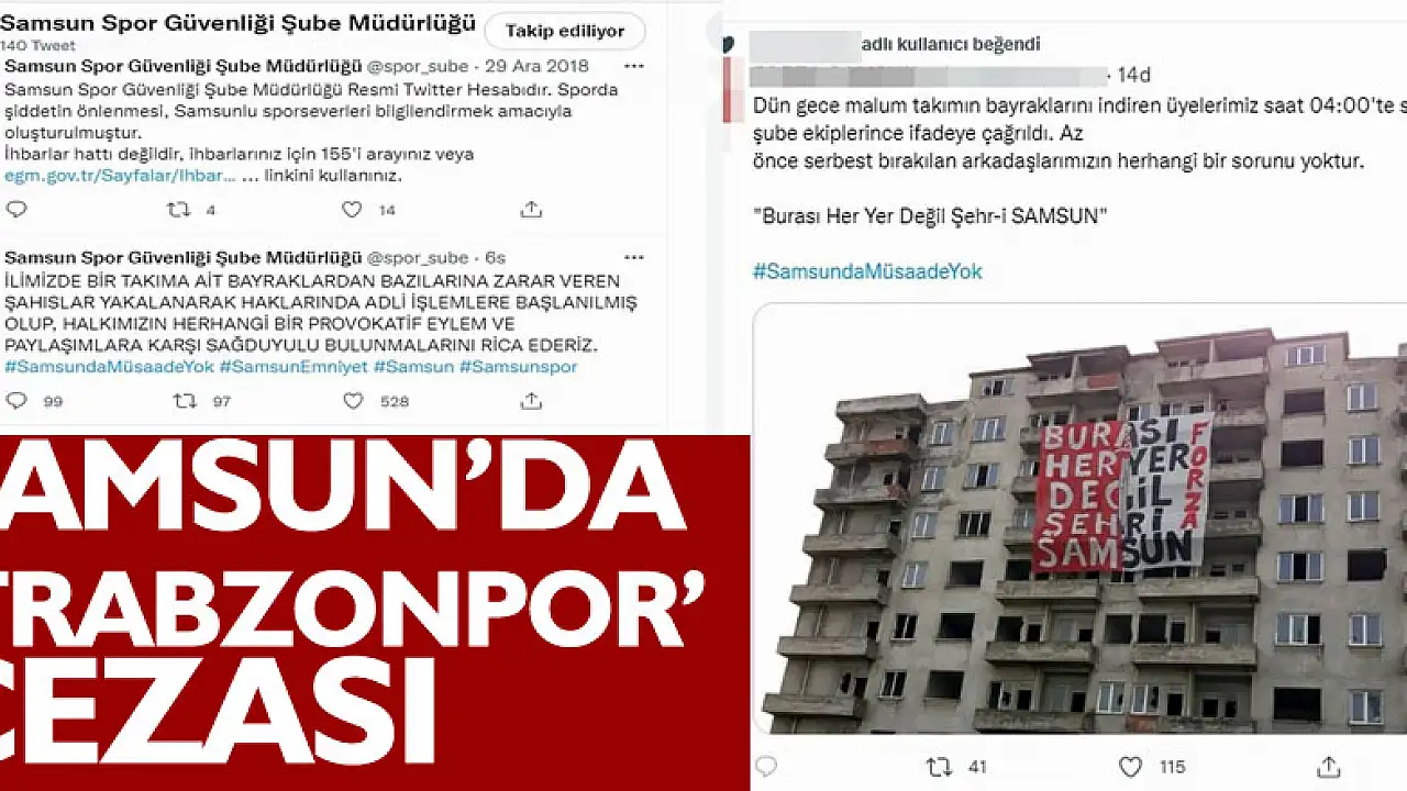İl Emniyet Müdürlüğü Samsun Spor Güvenliği Şube Müdürlüğü, sosyal medya hesabından yaptığı açıklamada olay hakkında şu ifadelere yer verdi: “İlimizde bir takıma ait bayraklardan bazılarına zarar veren şahıslar yakalanarak haklarında adli işlemlere başlanılmış olup, halkımızın herhangi bir provokatif eylem ve paylaşımlara karşı sağduyulu bulunmalarını rica ederiz.” Trabzonspor bayrağına zarar verdiği tespit edilen 4 kişinin spor müsabakalarından men edildiği öğrenildi.