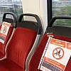 Samsun'da toplu taşımada yapılan korona virüsü önlemleri kapsamında sosyal mesafeye dikkat edilmesi için tramvaylarda koltuklara uyarı yazıları yerleştirildi.