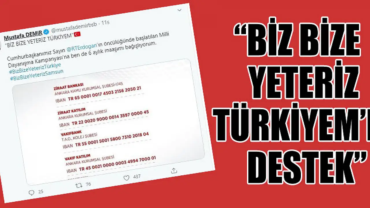 Samsun Büyükşehir Belediye Başkanı Mustafa Demir, Cumhurbaşkanı Recep Tayyip Erdoğan öncülüğünde başlatılan Milli Dayanışma Kampanyası'na 6 maaşını bağışlayarak destek verdiğini açıkladı. Başkan Demir sosyal medya hesaplarından yaptığı açıklamada, “Biz bize yeteriz Türkiyem. Cumhurbaşkanımız Recep Tayyip Erdoğan’ın öncülüğünde başlatılan Milli Dayanışma Kampanyası’na ben de 6 aylık maaşımı bağışlıyorum” dedi.