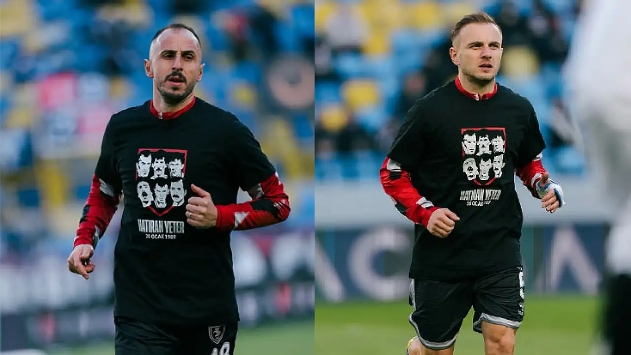 Kırmızı-beyazlı futbolcular, karşılaşma öncesi ısınmaya, kulüp tarihine “kara gün” olarak geçen kazada yaşamını yitiren isimlerin fotoğraflarının yer aldığı tişörtlerle çıktı.
