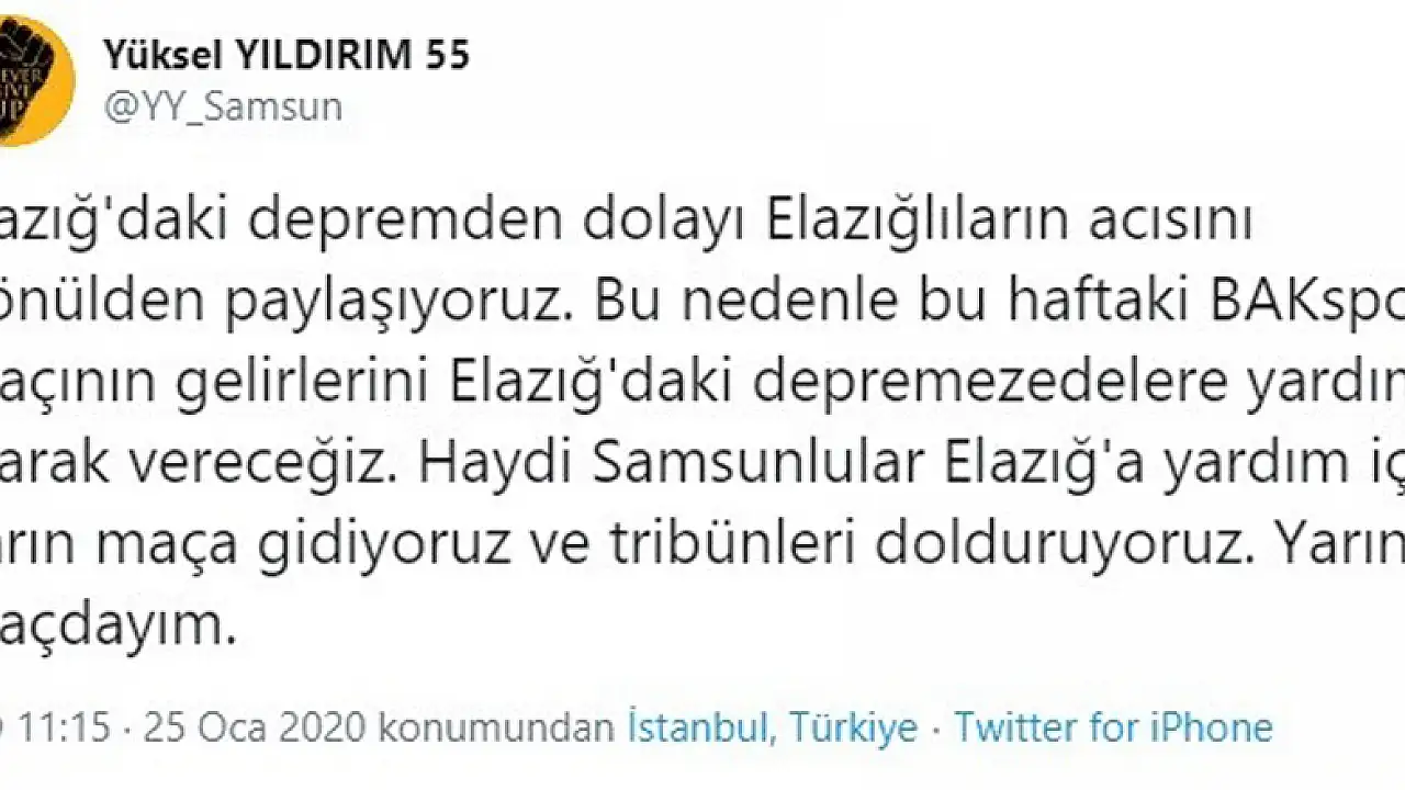 Sosyal medya üzerinde yaptığı açıklama ile vatandaşları tribünleri doldurmaya davet eden Yıldırım, “Elazığ'daki depremden dolayı Elazığlıların acısını gönülden paylaşıyoruz. Bu nedenle bu haftaki Bugsaşspor maçının gelirlerini Elazığ'daki depremezedelere yardım olarak vereceğiz. Haydi Samsunlular Elazığ'a yardım için yarın maça gidiyoruz ve tribünleri dolduruyoruz. Yarın bende maçtayım” ifadelerini kullandı.