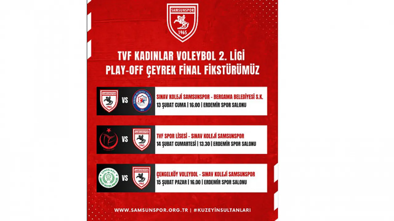 TVF Kadınlar Voleybol 2. Ligi'nde namağlup yoluna devam eden Sınav Koleji Samsunspor'un play-off çeyrek final programı belli oldu. 'Kuzeyin Sultanları', çeyrek finalde üç gün üst üste Samsun'da parkeye çıkacak.