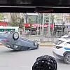 Şanlıurfa'da yük kamyonu ile çarpışan otomobil ters dönerken, otomobil sürücüsü kazayı burnu bile kanamadan atlattı.