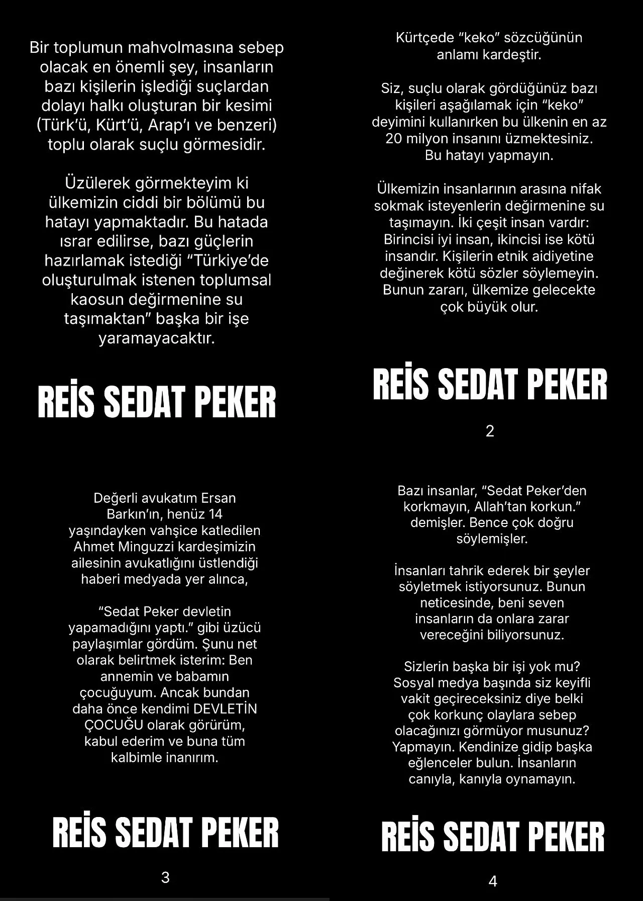 Ahmet Minguzzi davasında avukatının rolüyle ilgili sosyal medyada yapılan bazı yorumlara karşı çıkan Peker, “Değerli avukatım Ersan Barkın'ın, henüz 14 yaşındayken vahşice katledilen Ahmet Minguzzi kardeşimizin ailesinin avukatlığını üstlendiği haberi medyada yer alınca, 'Sedat Peker devletin yapamadığını yaptı' gibi üzücü paylaşımlar gördüm. Şunu net olarak belirtmek isterim: Ben annemin ve babamın çocuğuyum. Ancak bundan daha önce kendimi devletin çocuğu olarak görürüm, kabul ederim ve buna tüm kalbimle inanırım” ifadelerini kullandı.