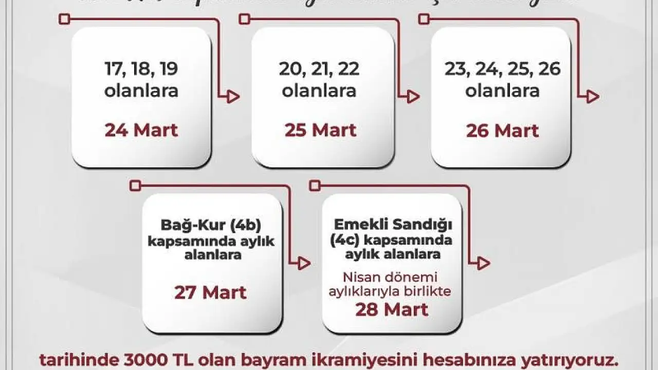 SGK, sosyal medya hesabı üzerinden Ramazan Bayramı ikramiyesinin 24 Mart tarihinden itibaren ödenmeye başlayacağını duyurdu. SSK(4a) kapsamında aylık alanlar için ödeme günü 17,18,19 olan vatandaşlar 24 Mart'ta, 20,21,22 olan vatandaşlar 25 Mart'ta, 23,24,25,26 olan vatandaşlar 26 Mart'ta, Bağ-Kur (4b) kapsamında aylık alan vatandaşlar 27 Mart'ta ve Emekli Sandığı (4c) kapsamında aylık alanlara Nisan dönemi aylıkları ile 28 Mart tarihinde 3 bin TL olan bayram ikramiyelerin hesaba yatırılacağı kaydedildi.