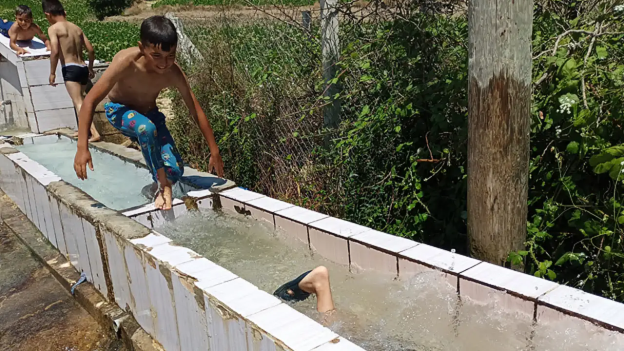 Çeşmeden akan suyun soğuk olduğunu belirten çocuklar, mahallelerinde yüzecek yer bulunmadığını söyledi. Çok sıcak olmasına rağmen suda üşüdüklerini belirten çocuklar, bu şekilde eğlendiklerini ifade etti.
