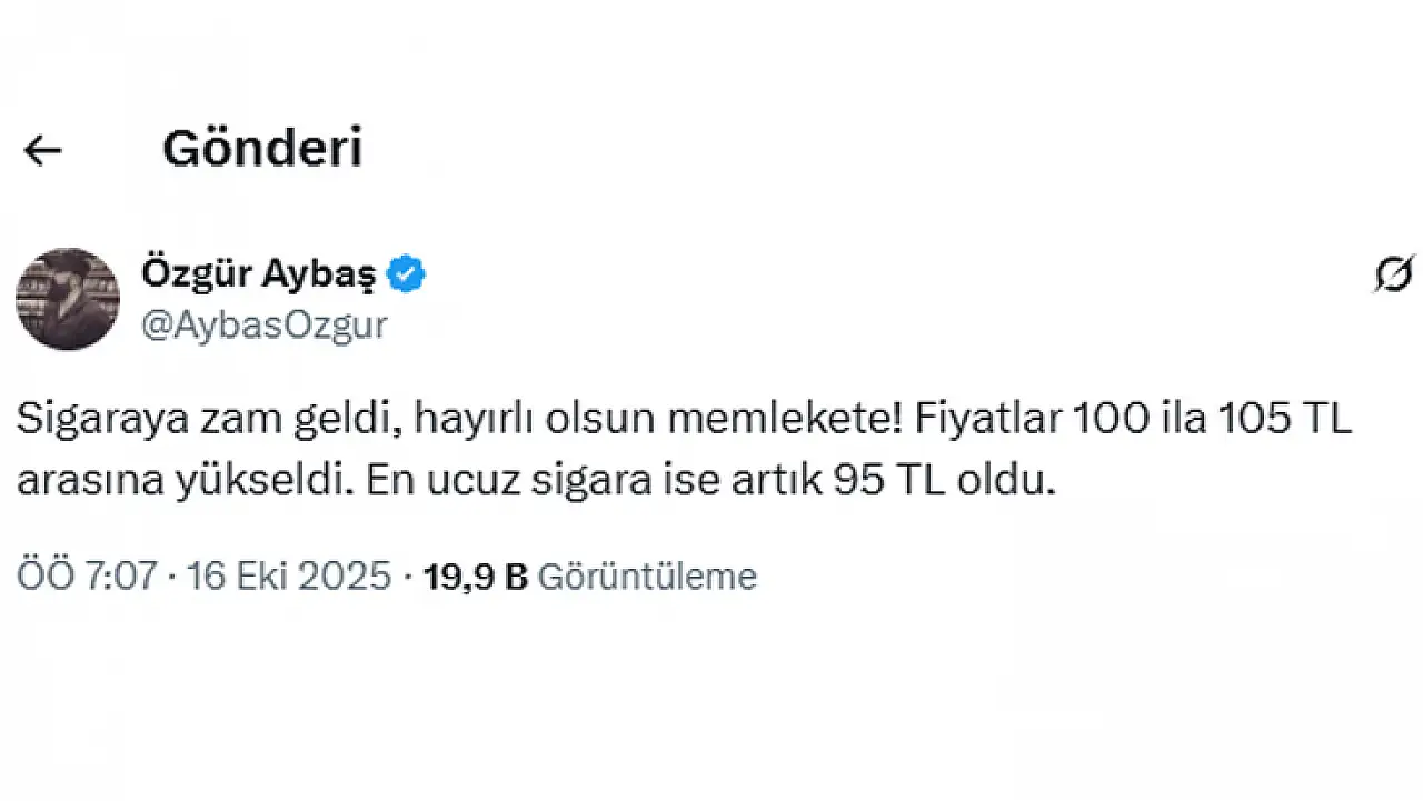 Türkiye Tekel Bayileri Platform Başkanı Özgür Aybaş, sigaraya gelen yeni zammı sosyal medya hesabından, duyurdu. Aybaş, sosyal medya hesabından, “Sigaraya zam geldi, hayırlı olsun memlekete! Fiyatlar 100 ila 105 TL arasına yükseldi. En ucuz sigara ise artık 95 TL oldu." paylaşımı ile yapılan zammı duyurdu