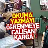Sıralardaki kalemlere dadanan ve aradığı yemeği bulamayan karga, bir süre sonra öğretmenler tarafından doğaya bırakıldı.