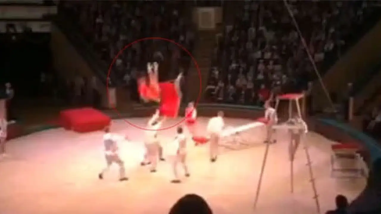 Belarus’un başkenti Minsk’te bir sirk gösterisinde gerçekleştirilen tahterevalli numarası, başarısızlıkla sonuçlandı. Havaya atılan genç kız, oturacağı koltuğu tutan aksamın kırılması sonucu kötü bir şekilde yere düştü. Neyse ki korkulan olmadı ve genç akrobat kazayı küçük bir yaralanmayla atlattı.