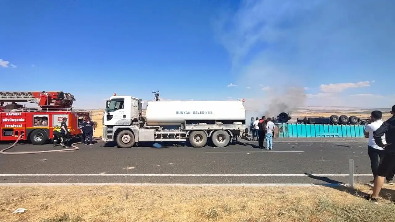 Kayseri'nin Bünyan ilçesinde bir şoför, devrildikten sonra yanan tırdan atlayarak kurtuldu.