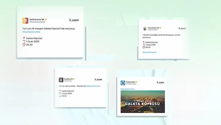 Filistin'de yaşanan katliama spor camiası sessiz kalmadı. Beşiktaş, Fenerbahçe, Galatasaray ve Trabzonspor art arda paylaşımlar yaparak 1 Ocak'ta İstanbul'da gerçekleştirilecek yürüyüş için çağrıda bulundu.