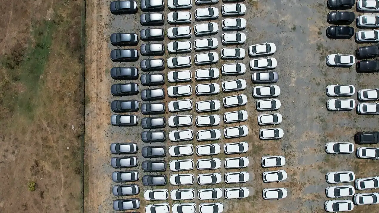 Görüntülerde aynı renk ve modellerden oluşan onlarca aracın yan yana dizildiği ve otoyol ile ormanlık alanın arasında bulunan etrafı çevrili çayırlık alanda stoklandığı görüldü.