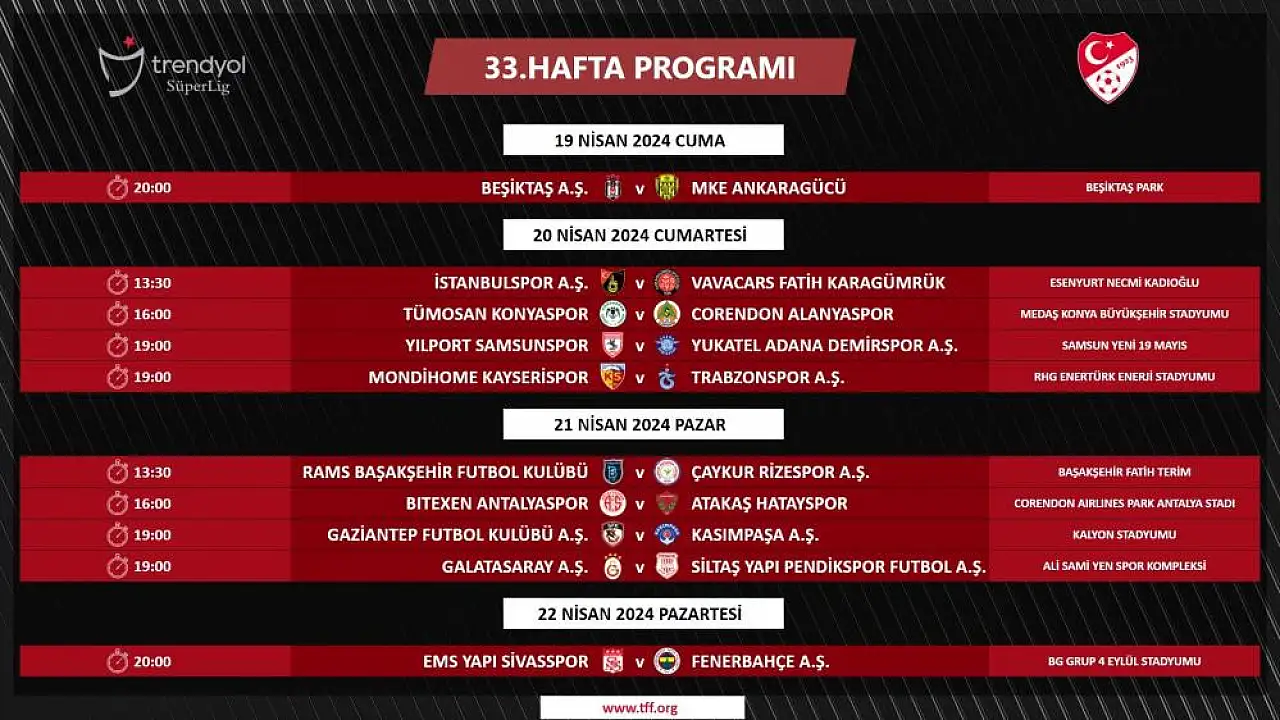 Türkiye Futbol Federasyonu, resmi internet sitesinden yaptığı açıklamada, Trendyol Süper Lig'in 33. haftasının programını duyurdu.