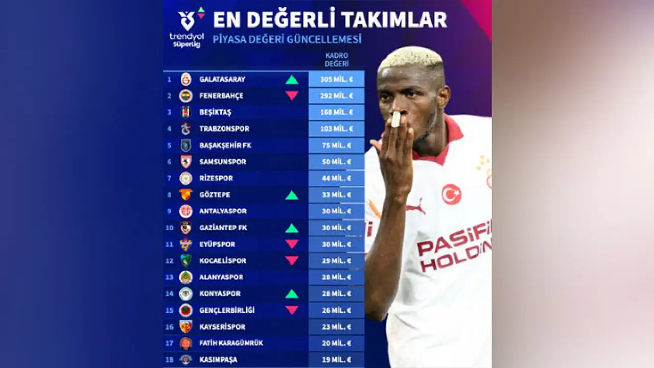 Trendyol Süper Lig ekiplerinin kadro piyasa değerleri güncellendi. Son verilere göre Galatasaray, 305 milyon avroluk kadro değeriyle ligin en değerli takımı oldu.