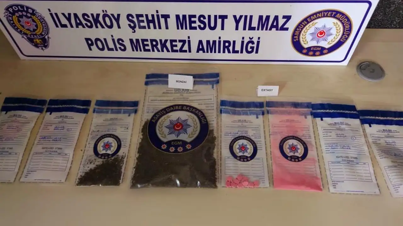Edinilen bilgiye göre, Samsun Cumhuriyet Başsavcılığı koordinesinde uyuşturucu ile mücadele kapsamında çalışma yapan İlyasköy Şehit Mesut Yılmaz Polis Merkezi ekipleri, İlkadım ilçesi Kadifekale Mahallesi’nde gece şüphe üzerine Ş.Ç. ve T.A. isimli şahısların üzerinde arama yaptı. Yapılan aramalarda toplam 40 gram bonzai, 10 adet ectacy hap ve 3,85 gram toz halinde extacy ele geçirildi. Olayla ilgili gözaltına alınan T.A. ve Ş.Ç. Samsun Emniyet Müdürlüğü Narkotik Suçlarla Mücadele Şube Müdürlüğü ekiplerine teslim edildi.