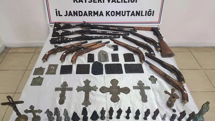Kayseri İl Jandarma Komutanlığı KOM Şube Müdürlüğü ve Melikgazi İlçe Jandarma Komutanlığı tarafından Anadolu Mirası operasyonları kapsamında yapılan çalışmalarda C.A.T. isimli şahsın iş yeri ve ikametinde ve aracında yapılan aramalarda Etnografik tarihi eserler kapsamında olan 8 adet kısa dipçik tabanca, 4 adet uzun dipçik tüfek ile Roma ve Bizans dönemine ait olduğu değerlendirilen 13 adet bronz tablet, 25 adet bronz heykel, 12 adet bronz obje, 18 adet sikke olmak üzere toplam 80 adet tarihi eser ve 1 adet kuru sıkı tabanca bulundu.