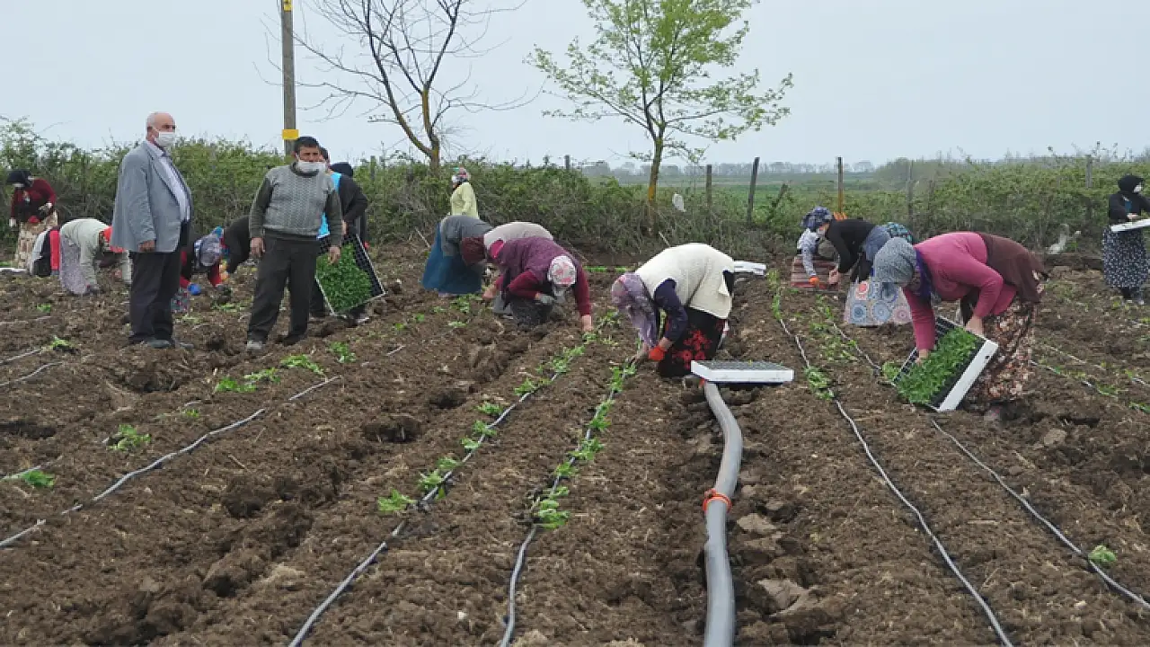 Samsun Bafra Ovası'nda başlanan yazlık sebze ekimlerinde çalışan tarım işçileri korona virüs (Covid-19) salgını gölgesinde mesai yapıyor. Bu zorlu mesaide işçiler maske ve eldiven takarak sosyal mesafeye özen gösteriyor.