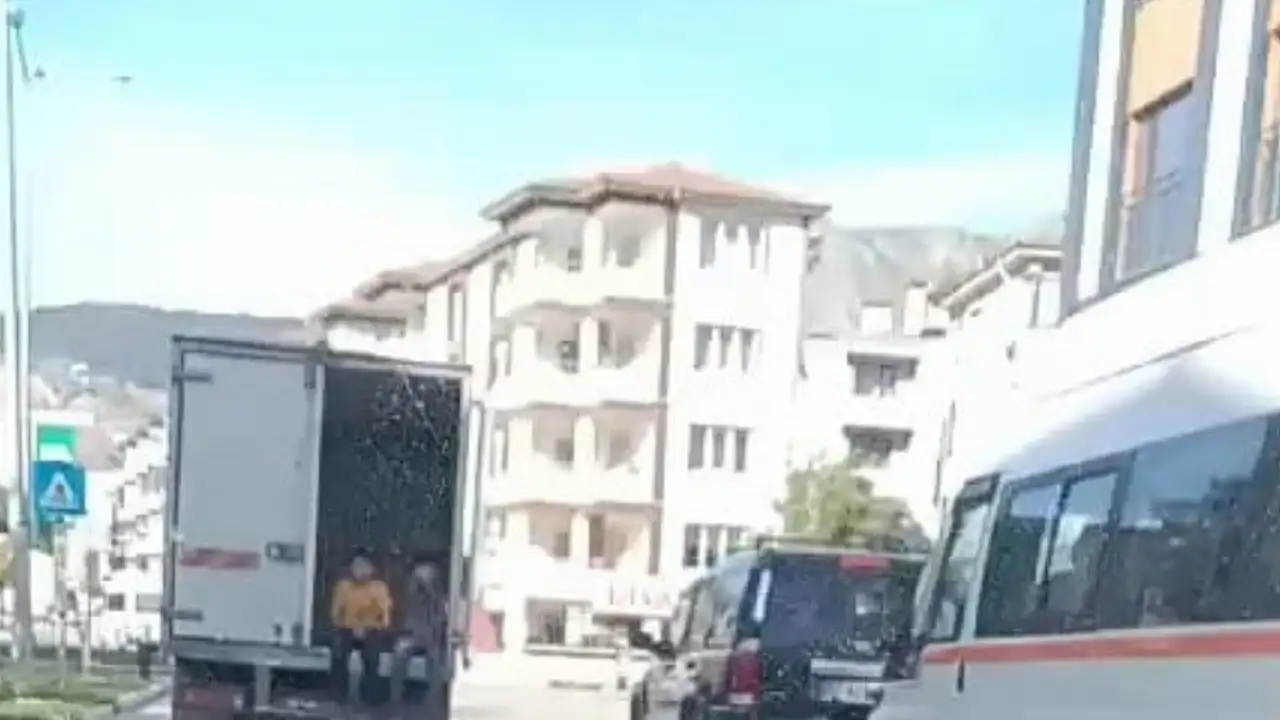 Cep telefonu kamerasına yansıyan görüntülerde, 2 çocuğun; kamyonetin, kapısı açık olan kasasında ayaklarını sarkıtarak yolculuk yaptığı ve aracın kent merkezinde hızla ilerlediği görülüyor.