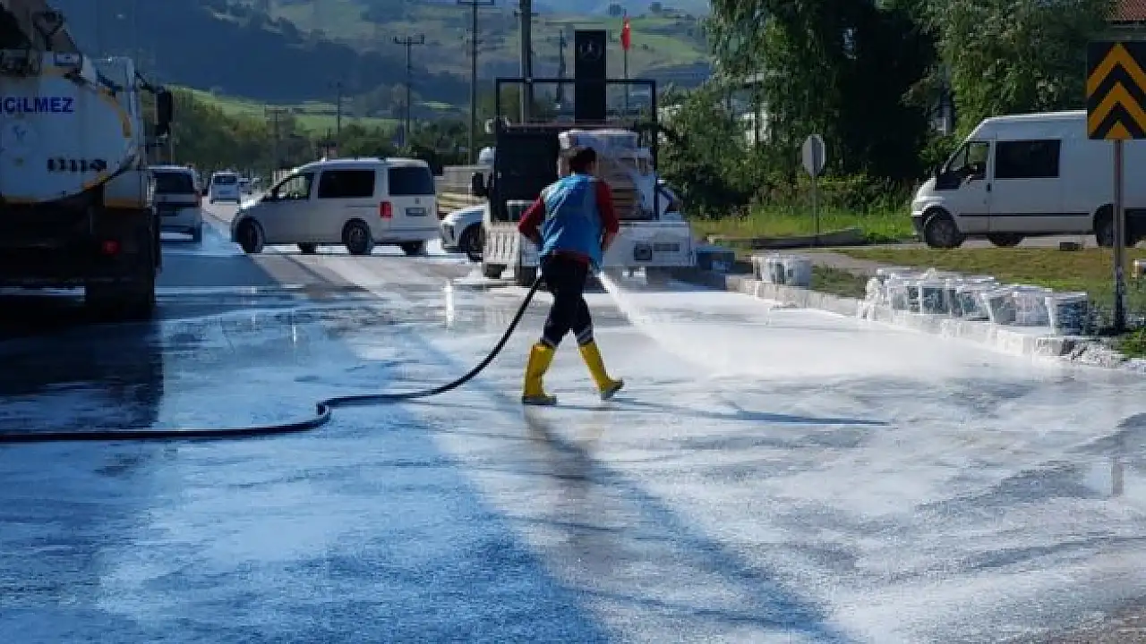 Samsun'da boya kutuları yola saçıldı, yol beyaza boyandı