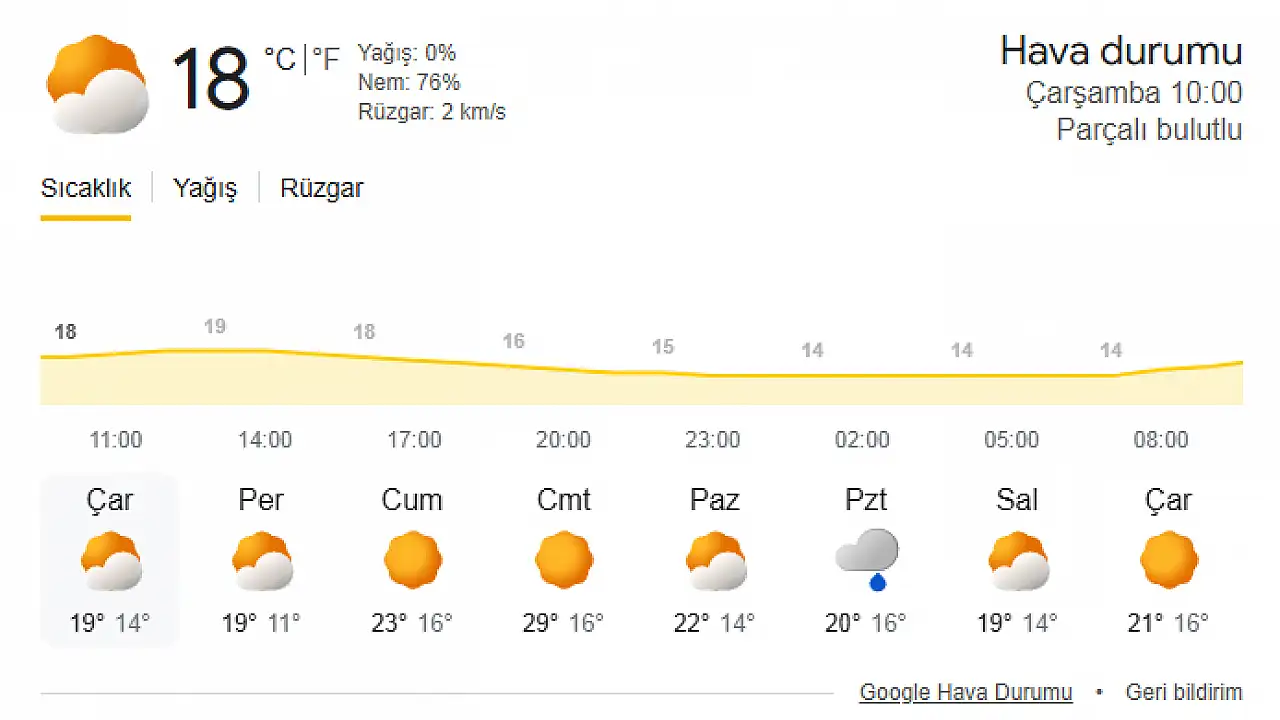 Meteoroloji verilerine göre perşembe günü ilçede 19°C’ye düşecek olan hava sıcaklığı, cuma gününden itibaren yeniden artış gösterecek. Cuma günü 23°C, cumartesi ise 29°C ile hafta sonunun en sıcak günü yaşanacak.
