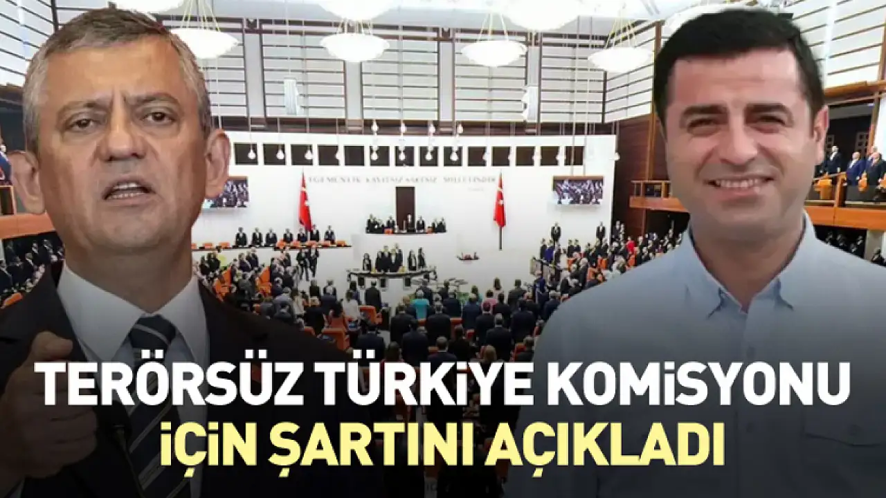 CHP Genel Başkanı Özgür Özel, Terörsüz Türkiye Komisyonu'na destek vermek için şartını açıkladı. Özel 'Bu süreçte cezaevinde ne Figen Yüksekdağ durabilir. Ne Selahattin Demirtaş durabilir. Ne Ekrem İmamoğlu durabilir. Ne de Ahmet Özer durabilir. Bunların konuşulacağı, çözüleceği, meselenin ilerleyeceği bir komisyonda oluruz.' dedi.