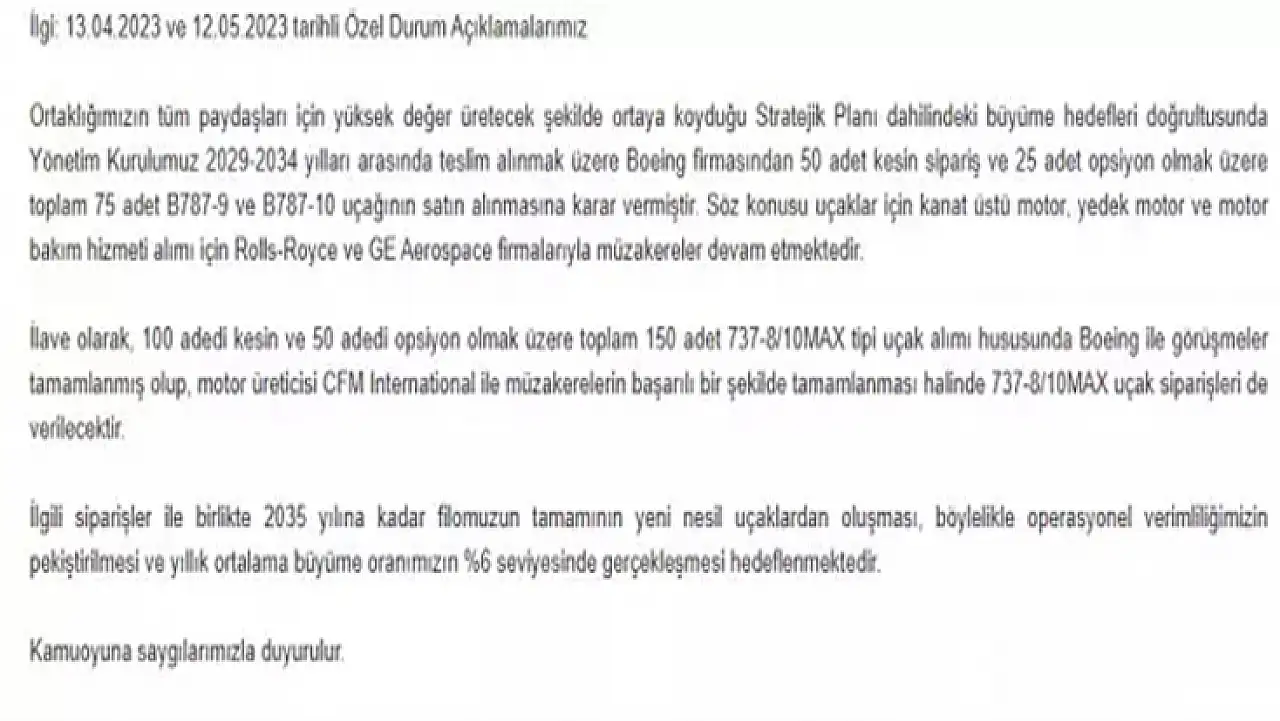 THY'nin KAP’a yaptığı bildirime göre, 2029-2034 yılları arasında teslim edilmek üzere Boeing firmasından 50’si kesin, 25’i opsiyon olmak üzere toplam 75 adet B787-9 ve B787-10 Dreamliner tipi uçak siparişi verildi. Açıklamada, söz konusu uçakların motor temini ve bakım hizmetleri için Rolls-Royce ve GE Aerospace firmaları ile görüşmelerin sürdüğü ifade edildi.
