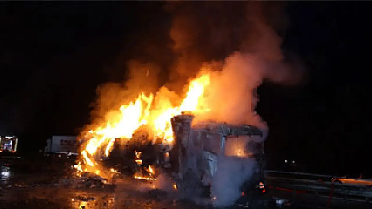 Sakarya TEM otoyolunda meydana gelen trafik kazası sonrası çıkan TIR yangınında bir kişi yanarak hayatını kaybetti.