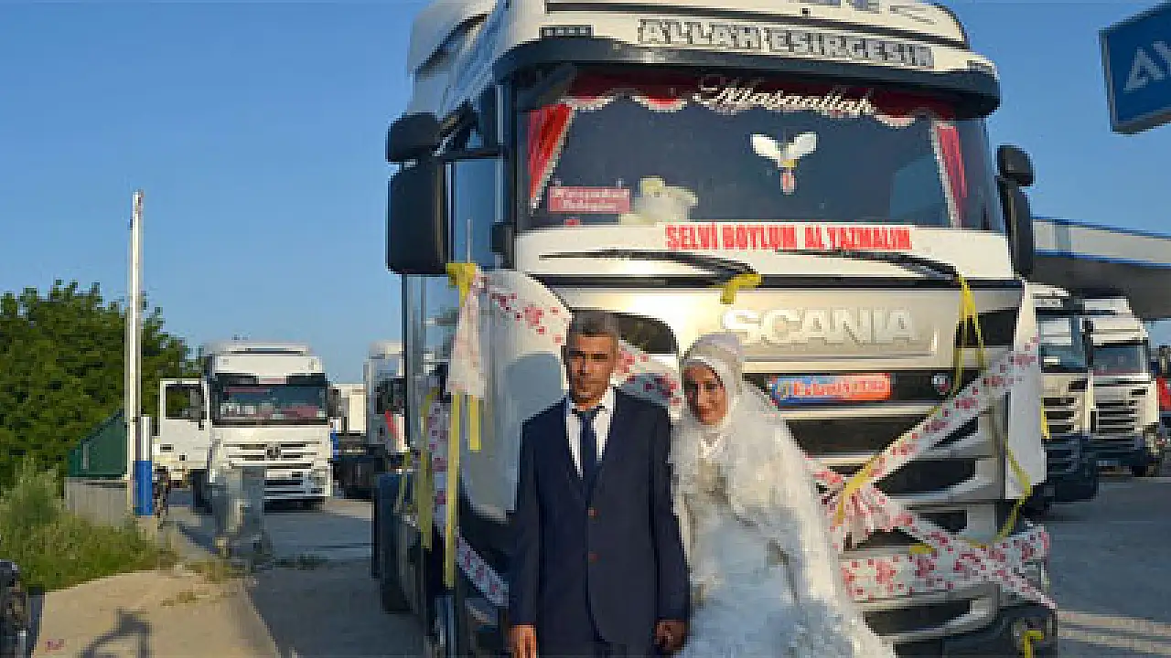 Sabır Kaçmaz, gelin ile birlikte Selvi Boylum Al Yazmalım yazısını yazdırdığı gelin arabası TIR çekicisiyle düğün yerine geldi. Damat Sabır Kaçmaz, 10 yıllık TIR şoförü olduğunu belirterek, "Böyle mutlu bir günümde TIR'ı yanımdan ayırmak istemedim. Eşim Esengül’e de söyledim. Hoşgörüyle karşıladı. Mutluyuz. İki bayramı bir arada yaşıyoruz” dedi.