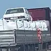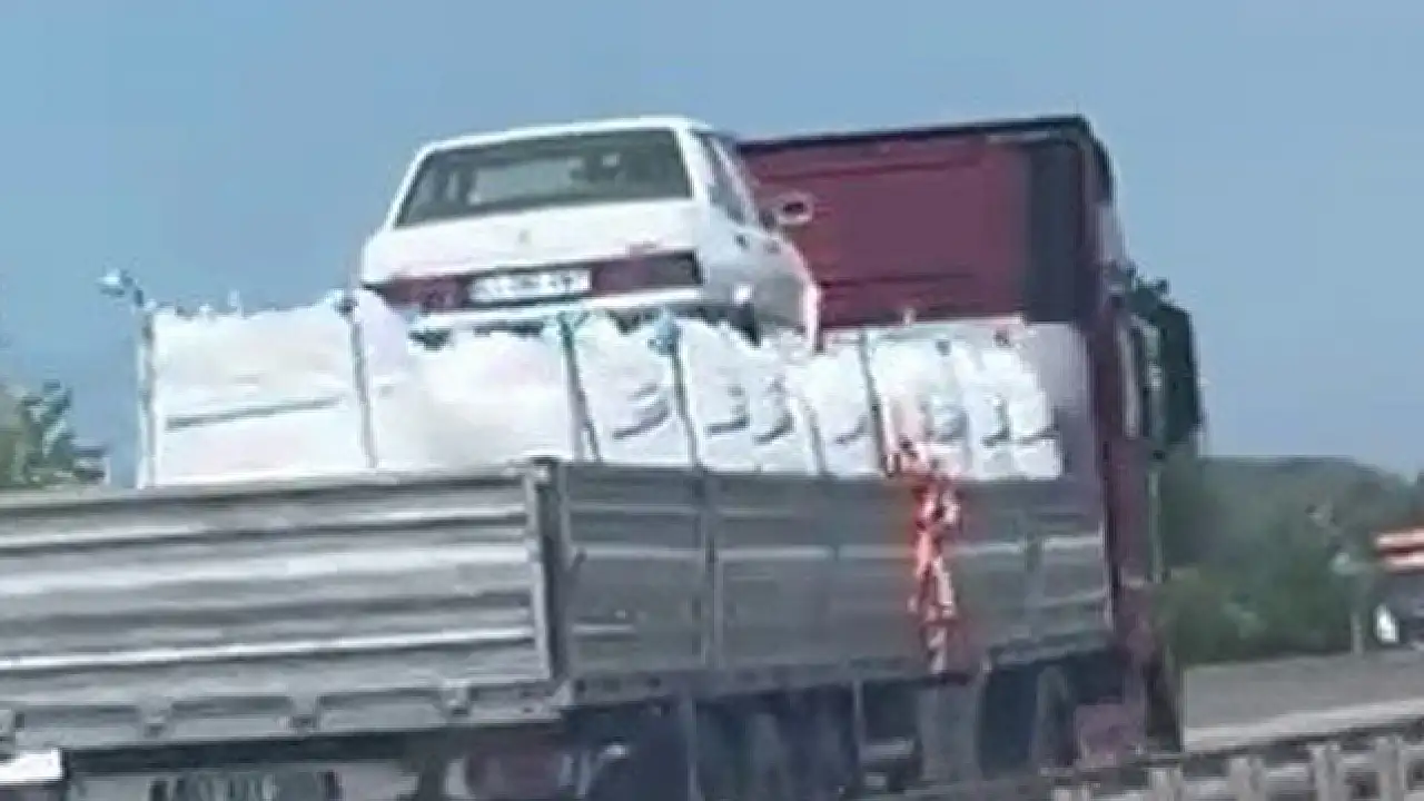 Sakarya D-650 kara yolunda seyir halinde çuval yüklü tırın üstünde otomobil taşındığını görenler hayrete düştü. Cep telefonu kameralarına yansıyan olayda, ilginç manzarayı gören dönüp bir daha baktı.