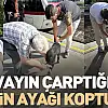 Bu sırada yolculardan biri elindeki poşeti, köpeğin kan kaybını azaltmak için bacağına bağladı.
