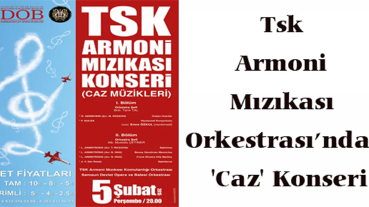 Armoni Mızıkası Orkestrası 65 kişilik dev bir kadroyla Samsun'a gelecek. Samsunlu müzikseverlerin büyük ilgi göstermesi beklenen konserde caz türünden önemli eserleri seslendirecek TSK Armoni Mızıkası, 185 yıllık geçmişi ile Türkiye'nin çok sesli müzik toplulukları içerisinde geleneğini aralıksız sürdüren en eski müzik kuruluşu ve tek senfonik bandosu.