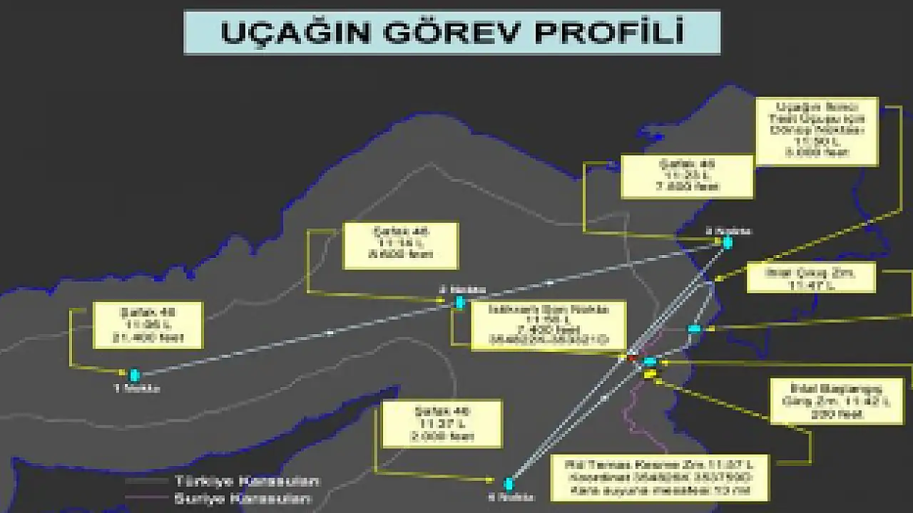 Sonuç olarak; elde mevcut radar görüntülerine ve yapılan idari araştırma sonucuna göre, uçağımız 12 mil olan Suriye karasularının bir mil dışında, takriben 13 mil uzakta vurulmuş ve istikrarlı uçtuğu en son noktanın koordinatı 35 48.22 Kuzey, 35 33.21 Doğu olup, bu noktadan itibaren süratle irtifa ve hız kaybettiği ve Suriye kara kıtasına 16 km. (8,5 mil) uzaklıkta, Suriye karasularında muhtemelen 35 48.26 Kuzey, 35 37.59 Doğu koordinatına düştüğü belirlenmiştir.