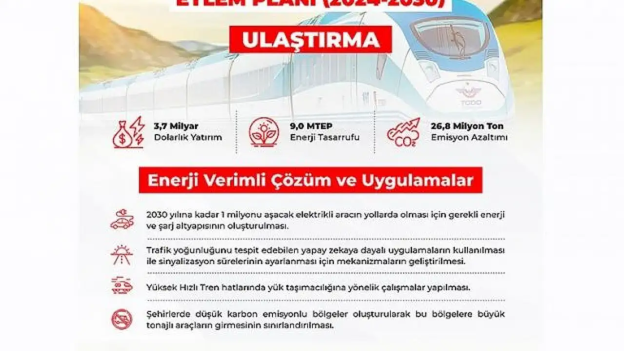 Enerji ve Tabii Kaynaklar Bakanlığının X hesabından yapılan paylaşımda, "II. Ulusal Enerji Verimliliği Eylem Planı ile ulaştırma sektöründe enerji verimli çözüm ve uygulamalara öncelik vereceğiz." ifadesi kullanıldı. Yapılan paylaşımda, 2024-2030 dönemini kapsayan eylem planında ulaştırma sektörüne yönelik hedefleri içeren grafiğe yer verildi. Söz konusu dönemde ulaştırma sektöründe enerji verimliliğini artırmak için toplam 3,7 milyar dolarlık yatırım yapılacak. Enerji verimli çözüm ve uygulamalar kapsamında, 2030'a kadar 1 milyonu aşkın elektrikli aracın yollarda kullanımını kolaylaştırmak için enerji ve şarj altyapısı oluşturulacak. Trafik yoğunluğunu tespit edebilen yapay zekaya dayalı uygulamaların kullanılması ve sinyalizasyon sürelerinin ayarlanması için mekanizmalar geliştirilecek.Yüksek hızlı tren hatlarında yük taşımacılığına yönelik çalışmalar yapılacak.Şehirlerde düşük karbon emisyonlu bölgeler oluşturularak bu bölgelere büyük tonajlı araçların girmesi sınırlandırılacak. Enerji verimliliğine yönelik çalışmalarla söz konusu dönemde 9 milyon ton eş değeri petrol enerji tasarrufu ve 26,8 milyon ton emisyon azaltımı sağlanacak.