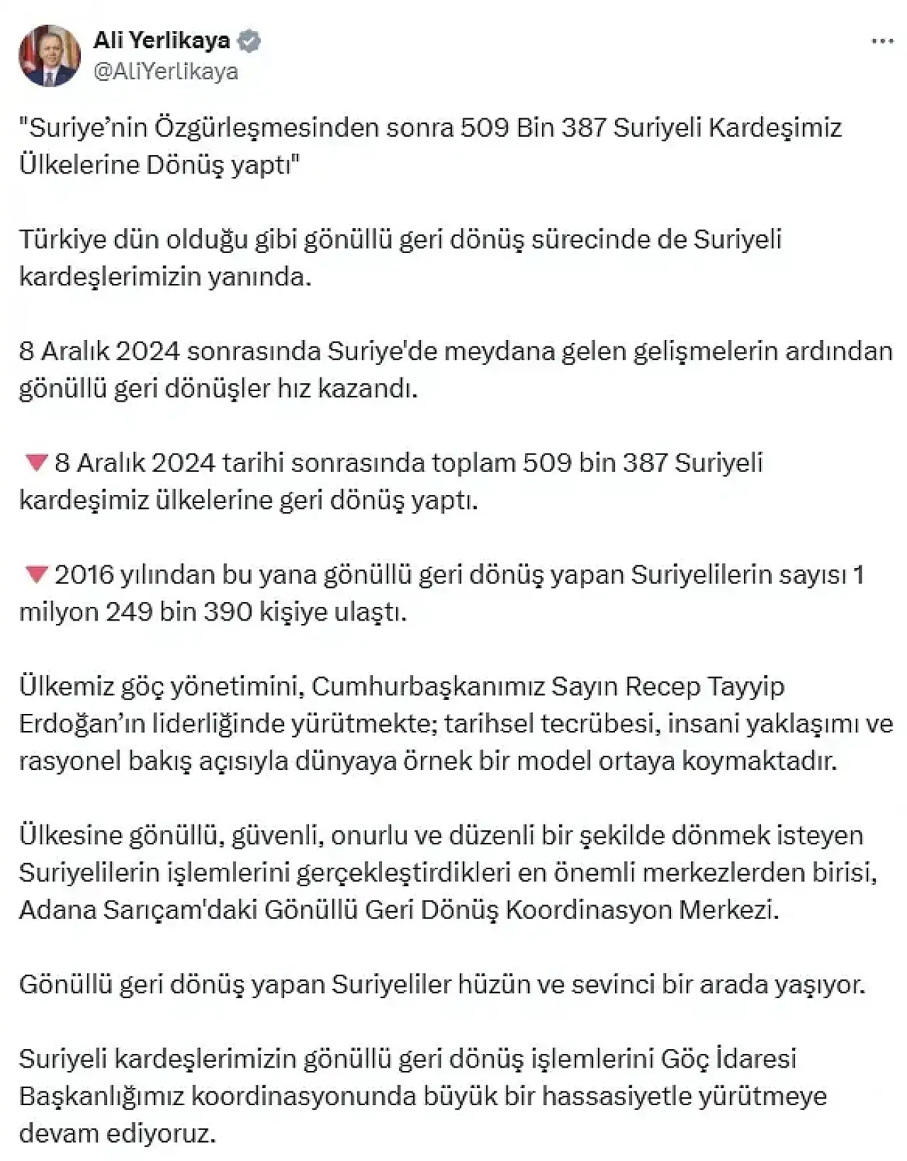 İçişleri Bakanı Ali Yerlikaya "Suriye'nin özgürleşmesinden sonra 509 bin 387 Suriyeli kardeşimiz ülkelerine dönüş yaptı. 2016 yılından bu yana gönüllü geri dönüş yapan Suriyelilerin sayısı ise 1 milyon 249 bin 390 kişiye ulaştı" açıklamasında bulundu.