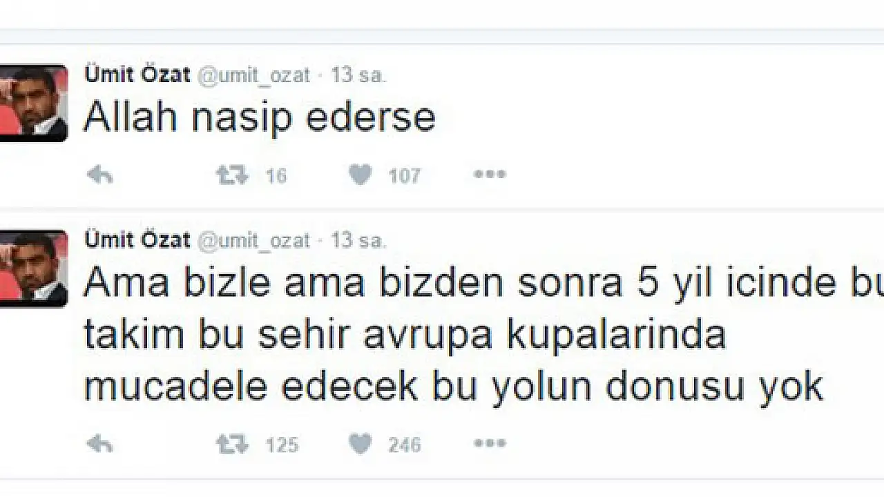 Özat, sosyal medya aracılığı ile Samsuınspor camiasına verdiği mesajda, “Allah nasip ederse ama bizle ama bizden sonra 5 yıl içinde bu takım bu şehir Avrupa kupalarında mücadele edecek bu yolun dönüşü yok” ifadelerini kullandı.