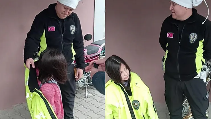 Ordu'nun Ünye ilçesinde görevli trafik polisleri, jimnastik kursuna giden 7 yaşındaki küçük kızın üşüdüğünü fark edince kendi montunu çıkarıp giydirdi. Polisin sergilediği örnek davranış, görenlerin içini ısıttı.