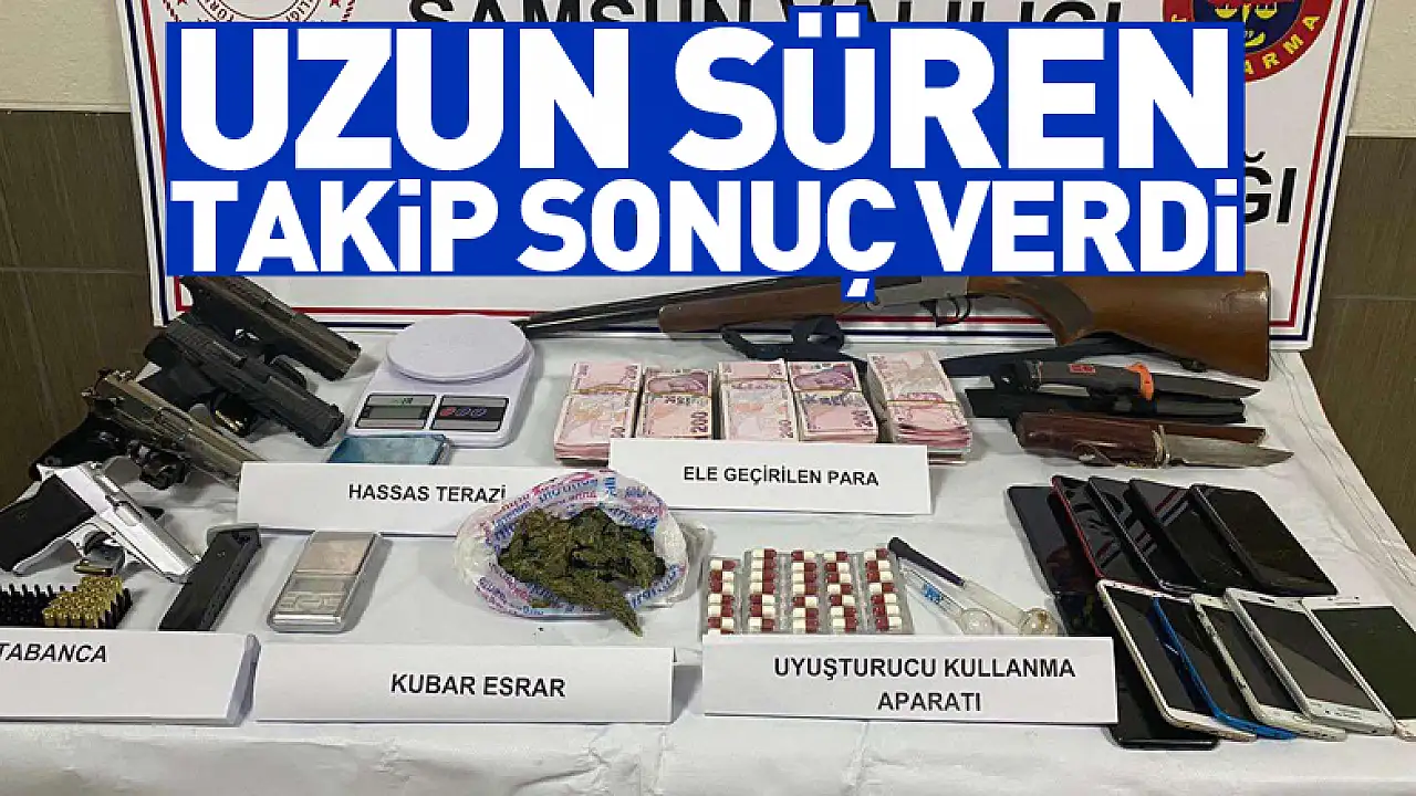Çarşamba Cumhuriyet Başsavcılığı tarafından koordine edilen operasyon kapsamında Samsun İl Emniyet Müdürlüğü Narkotik Şube müdürlüğü ekipleri tarafından şüpheliler uzun süre takip edildi. Operasyon kapsamında uyuşturucu sattığı değerlendirilen şüphelilerin ikametlerinde farklı tarihlerde arama yapıldı. Yapılan aramalarda yaklaşık 52 gr metamfetamin (36 fişek satışa hazır halde olmak üzere), yaklaşık 102 gr esrar, 35 adet sentetik ecza hapı, 6 adet uyuşturucu kullanmaya yarayan aparat, 4 adet hassas terazi, 5 adet silah, 126 adet mermi, 2 adet bıçak, 20 adet cep telefonu ve uyuşturucu satışından elde edildiği değerlendirilen yaklaşık 105.000 ₺ nakit para ele geçirildi..jpg)