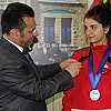 Vali Hüseyin Aksoy, genç sporcuyu tebrik ederek altınla ödüllendirdi.