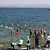 Sahil Güvenlik ve sağlık ekiplerinin kontrolünde göle giren 19 sporcu, 7 saat süren zorlu maratonu Ahlat İskelesi'nde tamamladı.