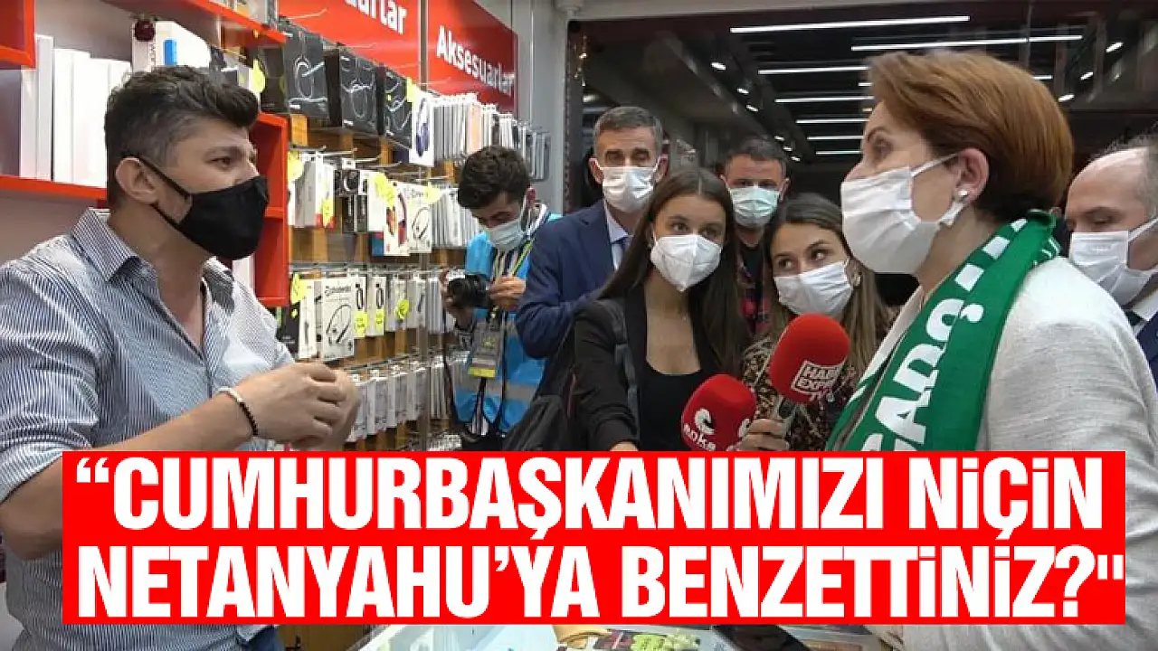 İYİ Parti Genel Başkanı Meral Akşener'in Samsun'un Çarşamba ilçesindeki esnaf ziyaretlerinde bir vatandaşla yaşadığı diyalog dikkat çekti. Vatandaş, Akşener'e 'Cumhurbaşkanımızı niçin Netanyahu'ya benzettiniz veya aynı ithamları Fetullah Gülen'e de söyley