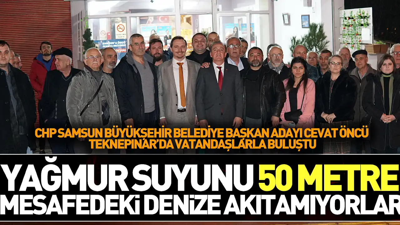 CHP Büyükşehir Belediye Başkan Adayı Cevat Öncü, Samsun’u her yağmurda sel sularının bastığını vurgulayarak, “Evet küresel ısınma oldu, evet bunu önleyemeyebiliriz. Ancak her yer asfalt, her yer beton, her yer yol. Suyun toprakla buluşmasının önüne geçmeye başladık. Hal böyle olunca su yüzeyden akıyor. Sen 30 yıl önce yapılmış altyapıyı rehabilite etmezsen, geliştirmezsen, büyütmezsen, üstelik onun bakımlarını bile doğru dürüst yapmazsan, yağmur kanallarını temizlemezsen bunun önüne geçemezsin. Belediye Evlerindeki alışveriş merkezinin önünde araçlar suda yüzer hale geldi. 50 metre ötede deniz var. Suyu 50 metre mesafedeki denize akıtamıyorsunuz. Bunu aklınız alıyor mu arkadaşlar? Bunun akılla izah edilebilecek tarafı var mı?