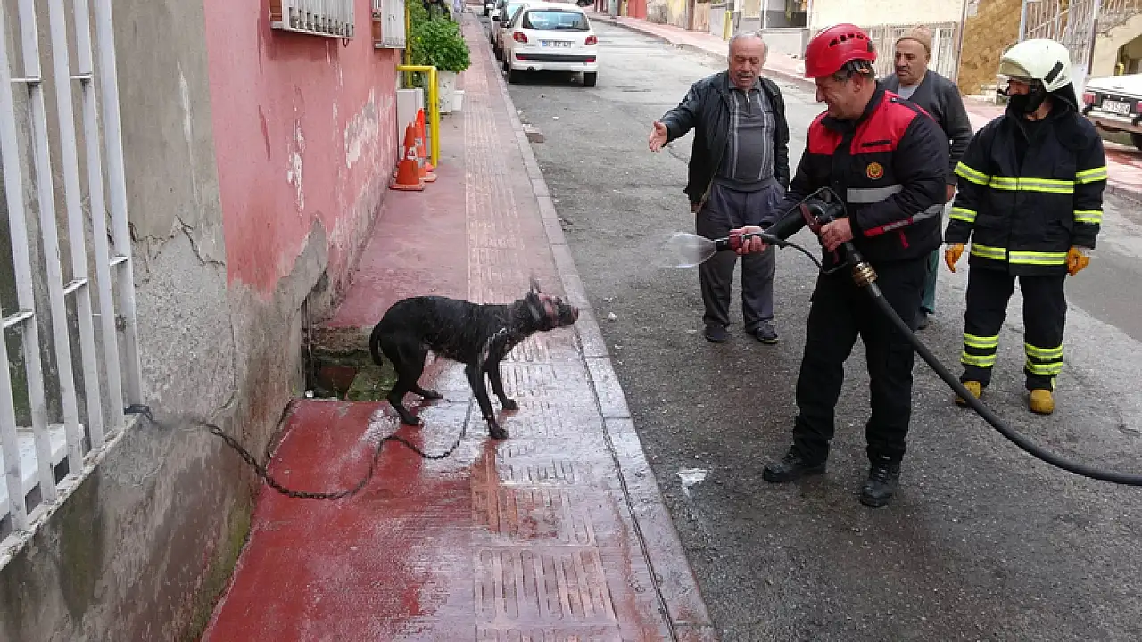 Yangında alevler içinden çıkartılan köpeğe itfaiyeden suyla ilk yardım