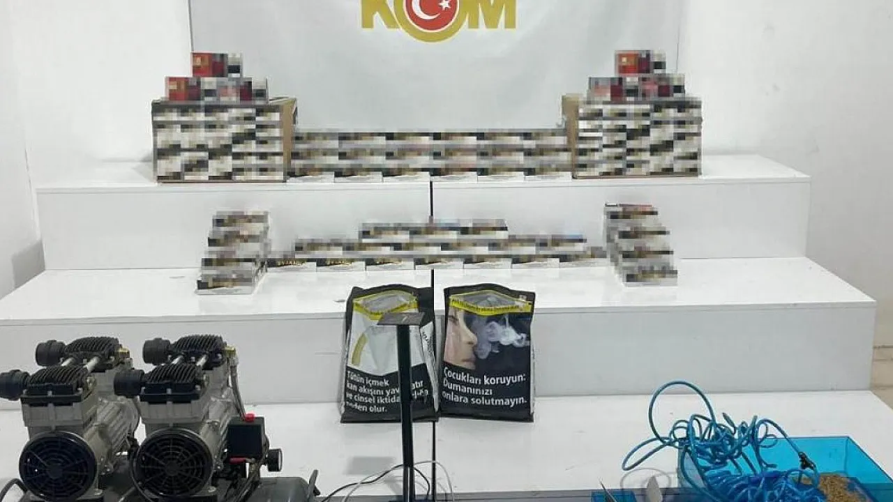 Yapılan aramada 3 bin 200 adet doldurulmuş makaron, 32 bin 400 adet bandrolsüz boş makaron, 1 adet elektrikli sigara sarma makinesi, 1 adet kompresör ve 1 kilo açık kıyılmış tütün ele geçirildi.