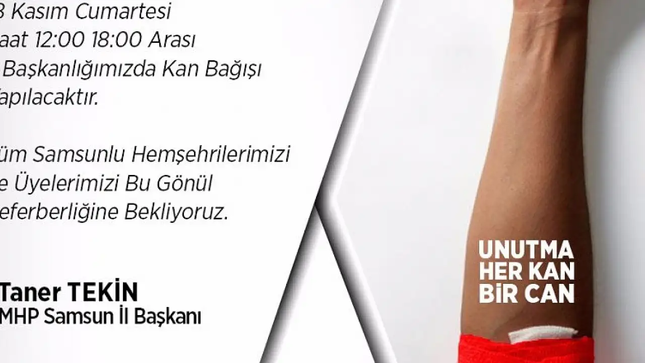 Kızılay Haftası nedeniyle Kan Bağışında farkındalık oluşturmak amacıyla ‘Kan Bağışı’ organizasyonuna hazırlanan Milliyetçi Hareket Partisi Samsun İl Başkanlığı tüm partilileri ve Samsun halkını 18 Kasım Cumartesi günü parti il binasında kan bağışında bulunmaya davet etti.