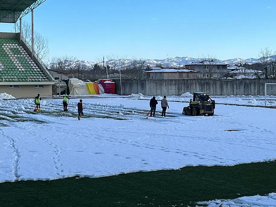 Çarşamba Spor Stadı'nda biriken karlar, yarın oynanacak maç öncesi temizleniyor. Çarşamba İlçe Gençlik ve Spor Müdürlüğü personeli ile Çarşamba Belediyesi Temizlik İşleri ekipleri, toplamda 30'u aşkın personelle saha ve çevresinde hummalı bir çalışma yürütüyor. Özellikle 'böcek' adı verilen küçük kepçelerle karların temizlenmesine öncelik veriliyor.