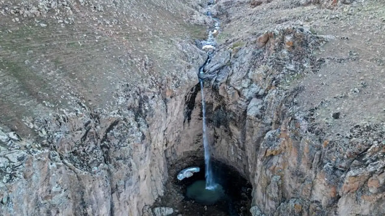 İlçeye 10 kilometre mesafedeki Muradiye Kanyonu'nda yer alan ve yılda bir ay akan şelale, havaların ısındığı bugünlerde doğa tutkunlarının ilgisini çekiyor. Karların erimeye başlamasıyla yeniden akmaya başlayan şelale, kanyonun ortasından dökülen sularıyla dikkati çekiyor. Yaklaşık 40 metre yüksekten akan şelale dron ile görüntülendi.