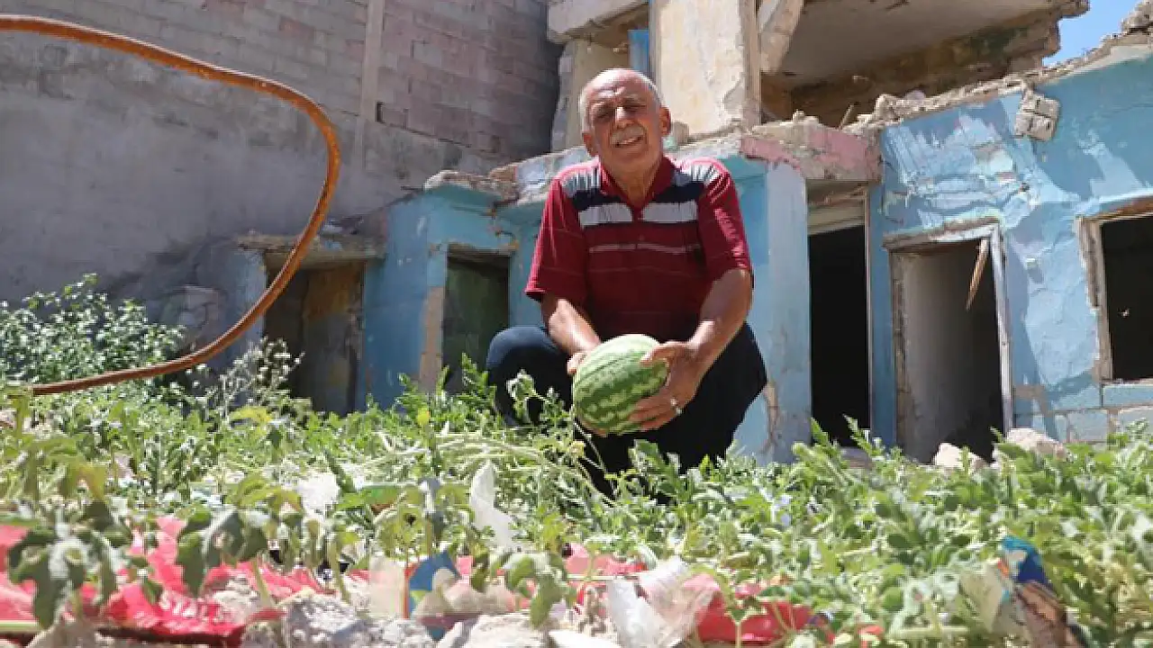 Madenboyu Mahallesi’nde yaşayan Nazmi Yamaner’in yıkılan evinin enkazının kaldırılmasının ardından arazide 4 adet karpuz çıktı. Karpuzlara özenle bakan Yamaner, 2 karpuzu çocukların kopardığını, geriye kalan diğer 2 karpuzuysa yiyeceklerini söyledi.
